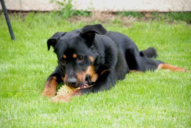 Im Haus ist er wirklich sehr brav und stellt auch nichts mehr an. Draußen hüpft und dopst er dafür wie ein kleiner Gummiball und hat am liebsten etwas zum Spielen dabei. Wird das mal vergessen, vergnügt er sich mit Maiskolben, Stöckchen oder ausgerissenen Grasbüscheln, die er in die Luft wirft, fängt, hinterherspringt und dann das Ganze wieder von vorne.