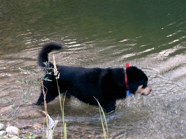 kann alleine umher laufen und auch ins Wasser. Zum schwimmen