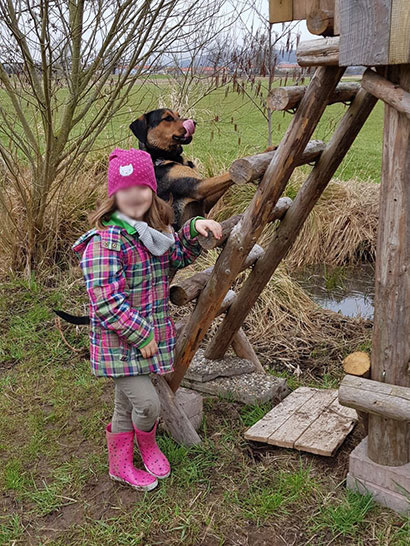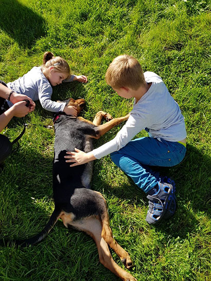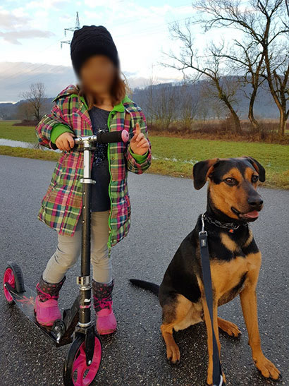 Nun ist Thor seit 2,5 Wochen bei uns und er lernt täglich dazu, genauso wie wir. Er hört immer besser auf uns, er springt fast nicht mehr an einem hoch, wenn er sich freut. Der Umgang mit anderen Hunden wird immer besser. Beim Spielen unterscheidet er zwischen den Kindern und uns Erwachsenen. Die Kinder lieben ihn (und wir auch)! Thor genießt die langen Spaziergänge durch den Wald oder über Wiesen und Felder. Er liebt die Streicheleinheiten von allen. Er ist nie alleine zu Hause, so dass auch das Spielen und Entdecken nicht zu kurz kommt.