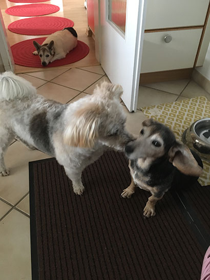 Mitte Januar durfte Tommy (für mich mehr ein Terriermix) aus dem kalten Tierheim Vesoul zu uns auf Pflegestelle umziehen. Der niedliche Bursche war zu Anfang unsicher. Jeden Tag fasste er aber ein bisschen mehr Vertrauen und mit Unterstützung "der Rentnergang" wurde er von Tag zu Tag zugänglicher und auch anhänglicher. Aber Tommy hat vermutlich ein Trauma erlitten. Wenn man ihn bürstet und es zippt, dann zeigt er fleissig seine Zähne, dies mag er grundsätzlich nicht! Ich gehe schwer in der Annahme, dass man Tommy mit Gewalt gebürstet hat und er sich gelernt hat wie man sich am allerbesten wehrt :(( Ich habe Zeit und mit dem nötigen vertrauen,werden wir Tommy zeigen, dass wir Menschen auch geduldig und lieb sein können. Eigentlich sollte er ja vermittelt werden, da wir ihn eher nicht bei Kindern sahen und Katzen nicht seine Freunde sind, gestaltete sich die Suche doch schwieriger. Aber nach einem Monat war er mir (und wir ihm) so ans Herz gewachsen das ich ihn nicht mehr hergeben wollte.