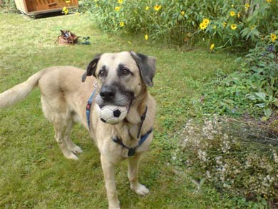 Voyou hat einen Quietscheball den er überall mit nimmt.