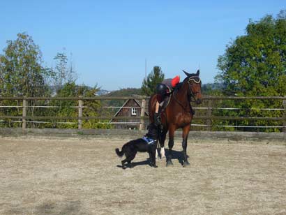 Winch lebt sich super ein und wird immer entspannter, er hat jetzt auch seine Angst vor Treppen überwunden und kommt überall hin mit. Er will mitkommen und steht immer bereit an der Türe. Aisha hat sich schon richtig mit ihm angefreundet, sie spielt jetzt auch mit ihm, sie hat allerdings nicht die Ausdauer von Maira, der jungen Dobermannhündin unserer Tochter. Mit ihr wird auch Winch wirklich müde. Auf einen kleinen Schrittausritt ist er auch schon mitgekommen. Es klappt wunderbar, wir haben schon fast das Gefühl, dass er schon ganz lange bei uns ist. Im Anhang ein kleines Foto, er lernt sehr schnell!