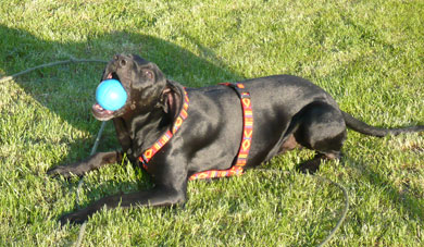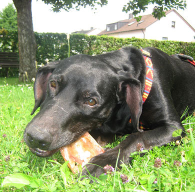 Pauli im Garten mit einem seiner heißgeliebten Schweineohren