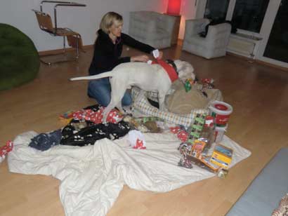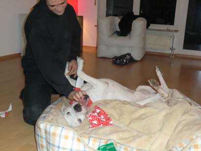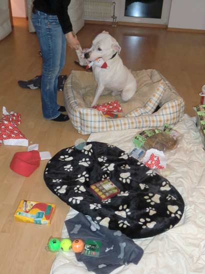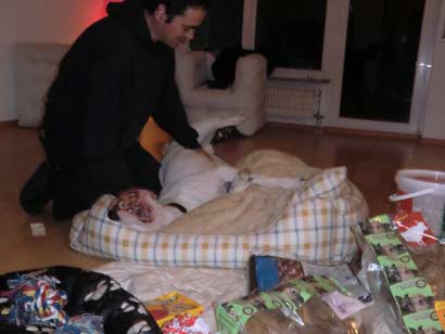 Sie hatte zusammen mit Ihrer Tochter sehr liebevoll ein Wichtelpaket für Nevio gepackt. Neben vielen Leckereien bekam Nevio auch ein neues Hundebett.