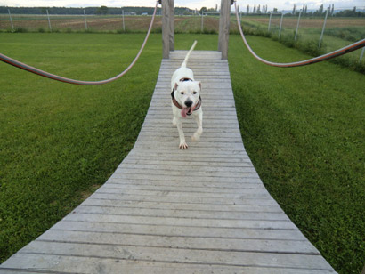 Nachdem er alles genau inspizierte, hatte unser Sorgenkind riesigen Spaß und tollte vergnügt über Hängebrücken und Wippen. Auch die Slalomstangen meisterte er mit Bravour. Hier spürten wir welch große Freude wir Ihm damit bereiten konnten.