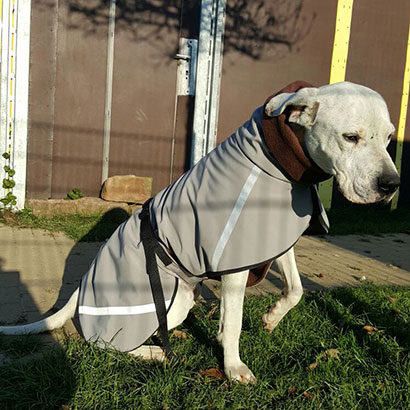 Nevio hat für die kalte Jahreszeit einen maßgeschneiderten Hundemantel von Felicitas Pöpsel von der Firma Hundelike bekommen.