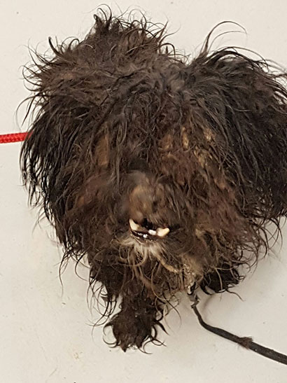Man mußte den kleinen Mixrüden das ganze Fell scheren, da er so sehr verfilzt war, dass das Kämmen eine Quälerei für ihn gewesen wäre.