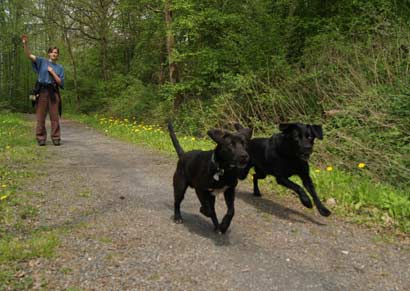 An der kurzen Leine läuft er auf das Kommando "Leine" direkt neben mir an meiner rechten Seite und ansonsten läuft er auch an der kurzen Leine ohne zu ziehen. Wenn er mit anderen Personen unterwegs ist, versucht er jedoch seinen Kopf durchzusetzen und man muss als Mensch konsequent sein und sich selbst durchsetzten. Wenn das jedoch einmal geschehen ist, funktioniert auch das an der Leine gehen gut.