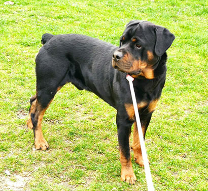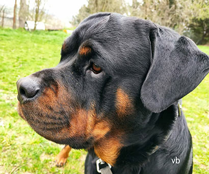 Rottweiler Rüde Norton wurde als Welpe gekauft und wuchs in einer Familie mit sechs Kindern, von ganz klein bis 20 Jahre, auf. Sein Besitzer hat viel Wert auf die Sicherheit der Kinder gelegt und so durften von klein auf keine Zerrspiele oder ähnliches mit Norton gespielt werden.