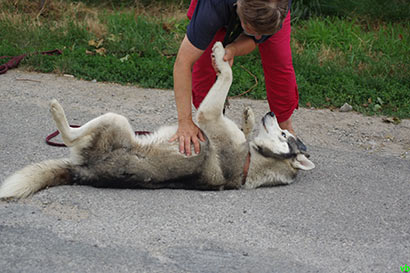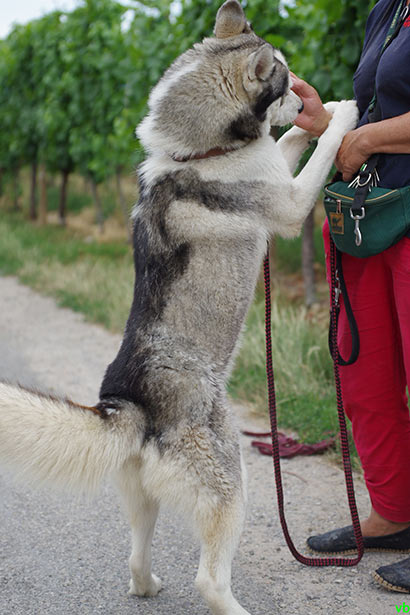 An der kurzen Leine zieht er etwas, umgehängt an eine Schleppleine geht es nach kurzer Zeit besser, da er mehr Freiraum hat und sich dann auch seiner Lieblingsbeschaftigung, dem Mäuse jagen widmen kann.