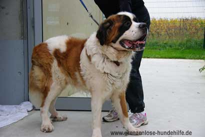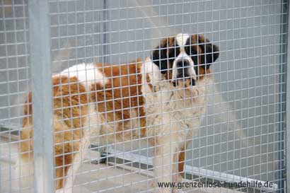 Als wir die Zwingerreihen entlang gingen trafen wir auf einen freundlichen Bernhardiner Rüden. Wir wurden im Vorfeld schon gewarnt, dass er in keinem guten Zustand angekommen sei.... Fassungslos und mit den Tränen kämpfend stellten wir fest, dass Obelix in einem sehr verwahrlosten Zustand ist. Wir haben Ihm am Zwinger Leckerlis gegeben, die er freundlich nahm. Als eine Gassigängerin Ihn rausholte ging er tolpatschig, aber lieb, mit. Sein Gangbild stimmt nicht. Sein Allgemeinzustand ist eher schlecht. Der liebe Kerl hat keine Muskulatur an den Beinen. Augen und Ohren sind ungepflegt. Der stattliche Rüde lag, laut Aussage der Gassigänger, die ersten Tage nur zusammengerollt auf dem kalten Zwingerboden und rührte sich einfach nicht... Dank lieber Gassigänger hat Obelix sich etwas gefangen. Er steht nun öfters in seinem Zwinger und geht auch auf kleine Gassirunden mit!!!