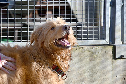 Auf dem Rückweg ins Tierheim sind wir einem Tierheim-Nachbarn begegnet, der etwas pöbelte, da hat Olaf zurück gepöbelt, lies sich allerdings sehr schnell ablenken.
