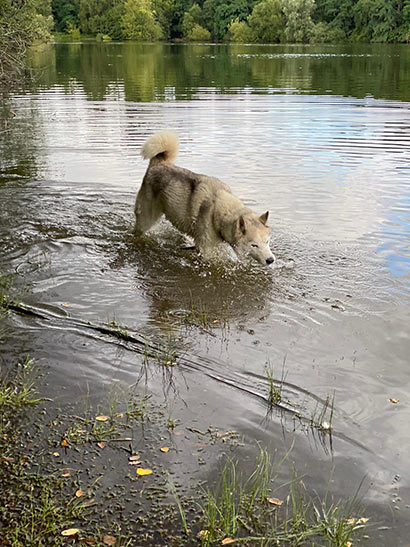 Hier mit dem souveränen Schäfermix Rüden Goliath und dahinter Husky Oreo.