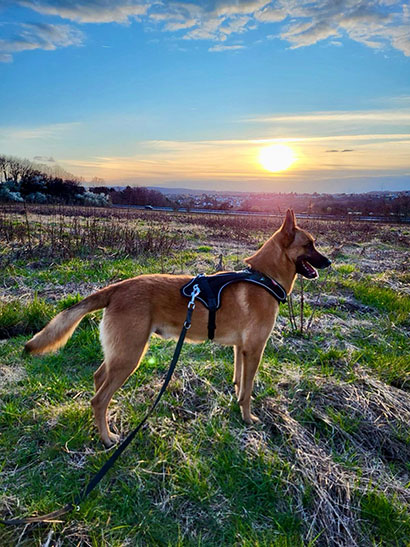 Hat er Vertrauen zu seinem Hundeführer ist er durchaus in der Lage mit einem ruhigen und souveränen Hund nebeneinander zu spazieren- das heißt nicht, dass er verträglich ist, sondern er akzeptiert und vertraut! Ruhephasen braucht und mag er auch: einfach die Natur genießen und durchatmen.