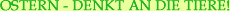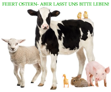 | Kaum ein Fest wird so stark mit Tieren assoziiert, wie Ostern. Da gibt es Osterhasen, Ostereier, den berühmten Osterschinken und natürlich auch das Lamm, sei es aus Kuchen oder ein echtes. In den Supermärkten stapeln sich schon seit Wochen bunt gefärbte Eier, Kaninchen- und Lammfleisch. Was sich dahinter an Tierleid verbirgt, wird von der Industrie geschickt verborgen und hinter niedlichen Bildern von Küken, Häschen oder Lämmchen versteckt. In Wirklichkeit ist Ostern für die Tiere das Fest des Todes. |