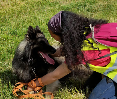 Wenn wir mit ihm in den Wald gehen, fernab von schnellen Bewegungsreizen, ist er ruhiger und ansprechbarer, läßt sich gerne beschmusen und kann dies auch geniessen.