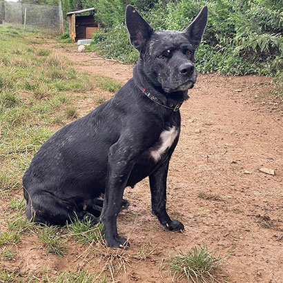Mit Artgenossen hat sie keine Probleme, aber Katzen sollten nicht in ihrem neuen Zuhause leben.