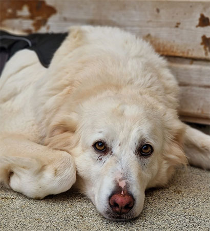 die betagte Dame ist eine Mischung aus einem Pyrenäenberghund (Mama) und einem Kangal väterlicherseits.