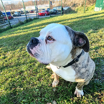 Potatoes ist eine liebenswerte , 4jährige American Bulldog Hündin, die gefunden wurde.