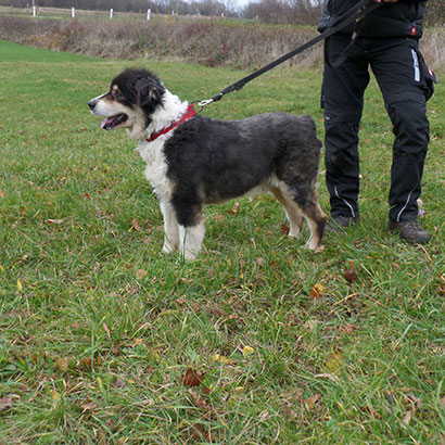 Uns zeigte sich der Rüde bestechlich mit Leckerlis und zugänglich.