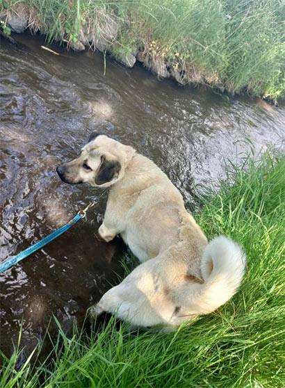 Bei diesen sommerlichen Temperaturen führen die Spaziergänge mit Ragnar zum nahegelegenen Bach und der Rüde genießt das kühle Nass offensichtlich.