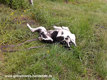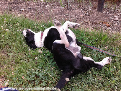 Nur bei Hundebegegnungen fängt Rex an etwas an der Leine zu ziehen. Als uns eine Hundedame verfolgt und er sie begrüssen darf, ist er ganz erfreut über den Hundekontakt.