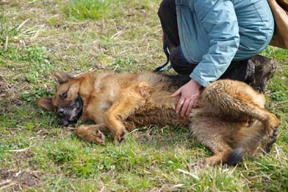 Rex muss zuerst Vertrauen fassen. Sie müssen zum Beispiel vermeiden ihm die um die Pfote gewickelte Leine zu lösen, sonst knurrt er. Er warnt, denn er weiss nicht, was sie mit ihm vorhaben.