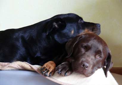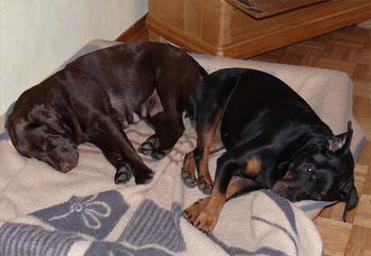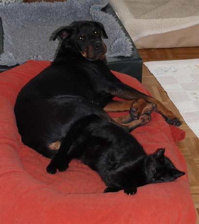 Aber auch Rita hat immense Fortschritte in ihrem Verhalten gezeigt. So wäre so etwas früher UNDENKBAR gewesen! Allein das bloße Hingucken in Ritas Richtung während sie frisst, wäre mit einem deftigen Knurren abgestraft worden. Manchmal knöttert sie zwar auch noch, aber Shana, die Katze, ist mittlerweile 18 Jahre und taub :-))