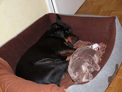 Abends kuschelt sich Rita seelig mit Stoffbiber und Jogurtbecher :-))