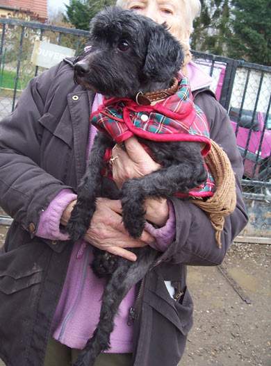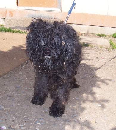 | Robi, ein kleiner alter schwarzer Wuschelmix-Rüde.
