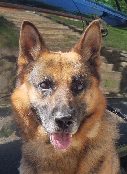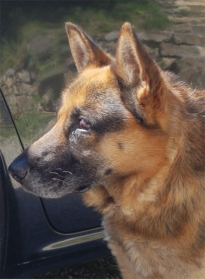 Rocky leidet an einer Schäferhundtypischen Augenkrankheit, der Schäferhund-Keratitis.