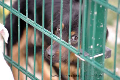 Im Zwinger hinten im Eck sitzend fanden wir die kleine Rosy. Eine bildhübsche Mixhündin die uns unsicher von unten anschaute:((