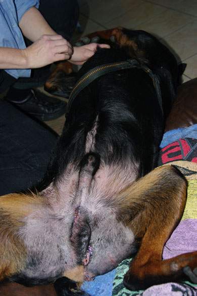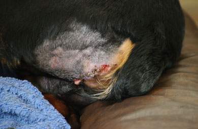 seinen Pfoten kleben. Seine operierte Abszesswunde