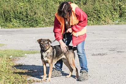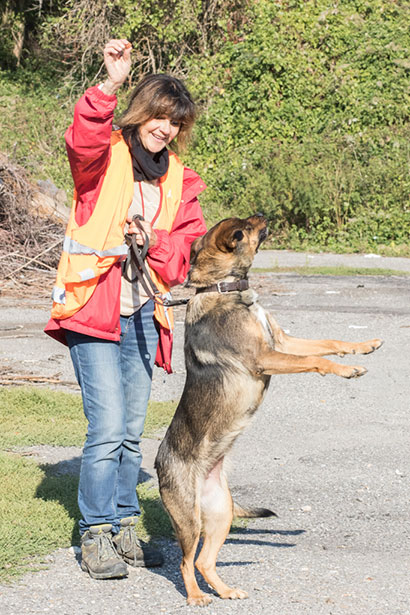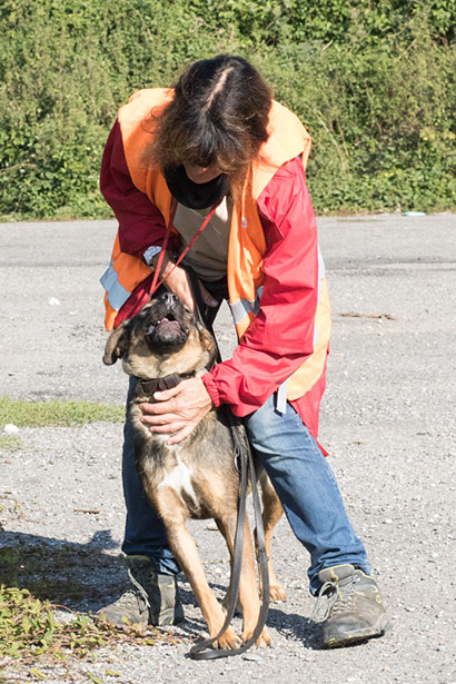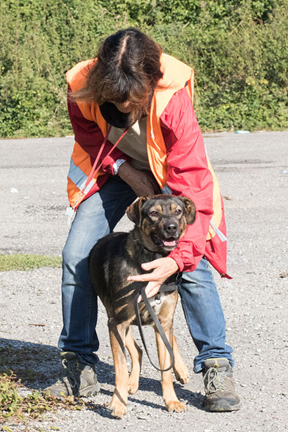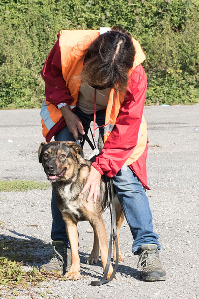 Für einen Spaziergang ist Roxy immer zu haben, anfangs ist sie verständlicherweise sehr hibbelig. Sie zieht dann etwas und beisst auch schon mal in die Leine.