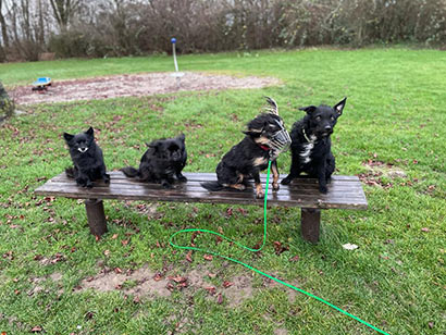 Samy fügt sich gut in seine ihm vertraute Hundegruppe ein, die ihn allerdings oft genervt von seinem Gerenne und Gequitsche zurechtweist.