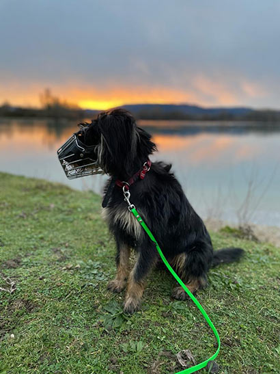 Samy wird, wenn es um Futter geht, immer seine Zähne einsetzen, auch gegenüber seinen Menschen. Deshalb muss Samy mit Maulkorb geführt werden. Sicherheit für Mensch und Hund.