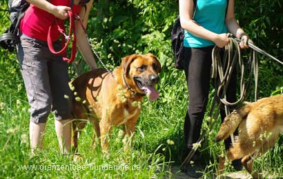 | Sergio ist ein Hund auf den zweiten Blick. Im Tierheim benimmt er sich wie ein Raudi, aber draußen ist er lieb und gut händelbar. Auf unserem gemeinsamen Spaziergang hat er sich sogar einschüchtern lassen von unserer "Zicke". Er war interessiert an ihr, aber hat Ruhe gegeben, nachdem sie ihre Grenzen aufgezeigt hat. Man hatte eher den Eindruck er orientiert sich an ihr :-) |