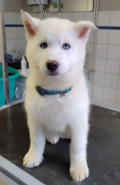 Der kleine reinrassige Siberian Huskyrüde Snow und seine Geschwister Anouk, Neige und Igloo wurden im Oktober 2024 geboren.