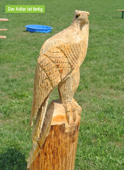 Herzlichen Dank an den Skulpturensägemeister Bertram Bilger, der im Schweiße seines Angesichts in 45 Minuten aus einem Baumstamm einen Adler sägte, der zu Gunsten von sans frontières e.V. versteigert wurde. Beeindruckend, wie aus einem einfachen Stamm mit Hilfe einer Motorsäge ein Kunstwerk wurde!