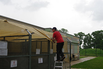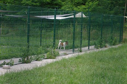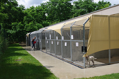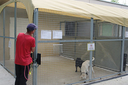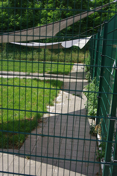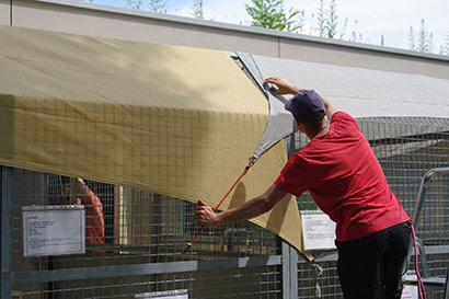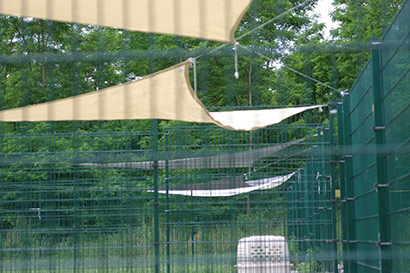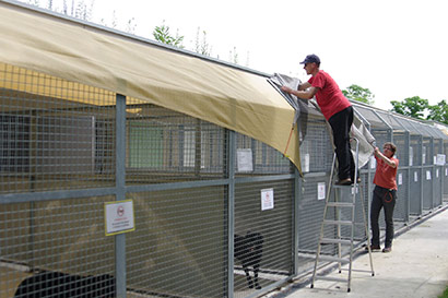 Wie im Jahr zuvor wurde auch die Zwingerreihe, die Mittags voll in der Sonne steht, beschattet. Dank der Spende von riesengroßen Sonnensegeln konnten wir in diesem Jahr zum Glück alle in der Sonne stehenden Zwinger beschatten. Fest verzurrt sollten Sie einigem standhalten können.