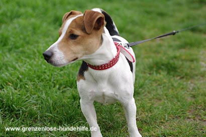 Der kleinere dreifarbige Jack Russel Rüde Stempy wurde im Tierheim abgegeben weil er den Jungen der Familie geschnappt hat.