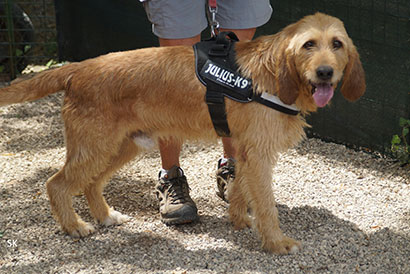 Ohne Problem konnte ich ihm das Geschirr anlegen. Als wir den Korridor entlang liefen, merkte man ihm an, dass die bellenden Hunde ihn sehr stressten.