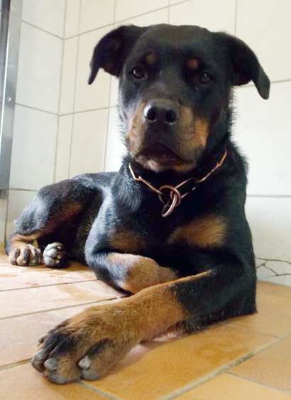 Die zierliche Rotti-Hündin Taya wurde von ihren Besitzern im Tierheim abgegeben. Die Lebensumstände haben sich geändert und da war kein Platz mehr für einen Hund.