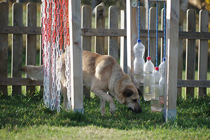 Er geht problemlos Treppen hoch und runter. Fährt gerne im Auto mit, läuft problemlos an Fahrrädern und vorbeifahrenden Autos vorbei.