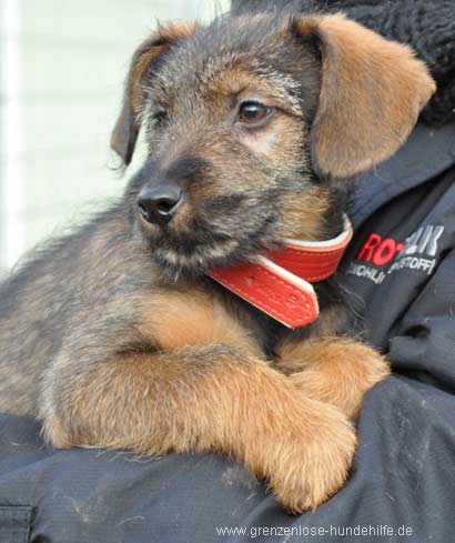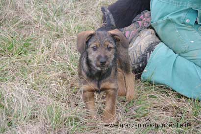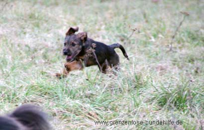Er ist ein kleiner lieber Kerl offen und fröhlich, hat Pferde kennengelernt und tobt mit anderen Hunden um die Wette.