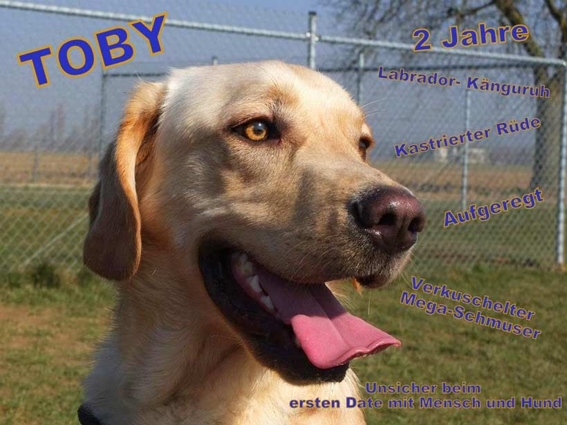 Wir suchen für Toby Menschen, die ihn erstmal so nehmen , wie er ist- ein aufgeregter junger Hund, der für und mit seinen Menschen alles macht und sich ganz unkompliziert zeigt, der aber nie, der „Klischee–everybodys–darling-Labrador“ sein wird, der überall problemlos mit hingenommen werden kann und sich über jede „patschende“ Hand und neue Bekanntschaften freuen kann oder sogar muss.