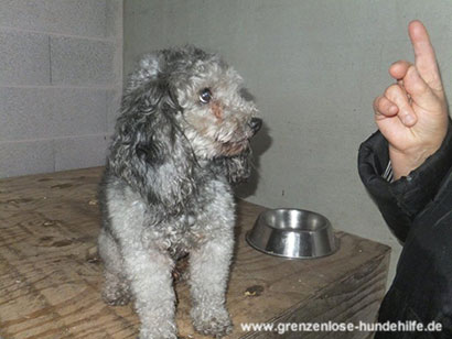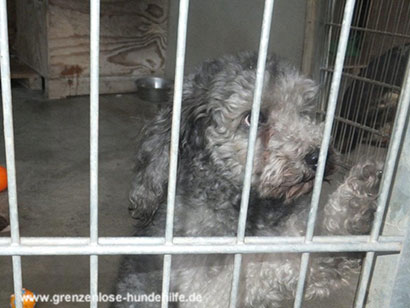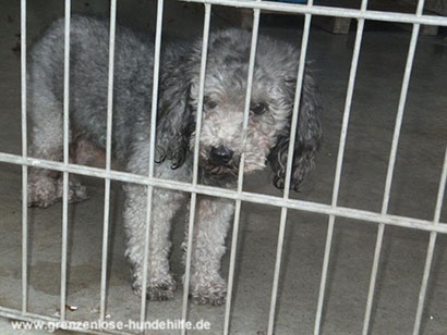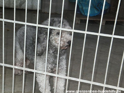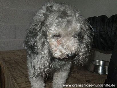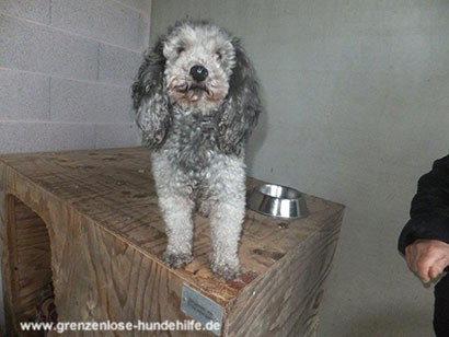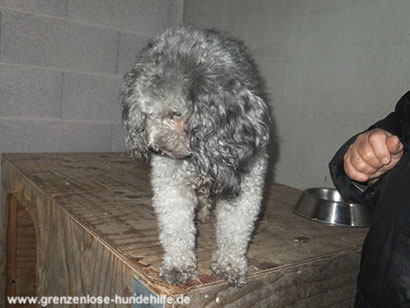 Toby wurde von seinen ehemaligen Besitzern offensichtlich gut gepflegt und sicherlich auch verwöhnt und ihn trifft der Umzug vom weichen Liegeplatz in der beheizten Stube in den jetzt kalten Zwinger bei Minusgraden besonders hart.