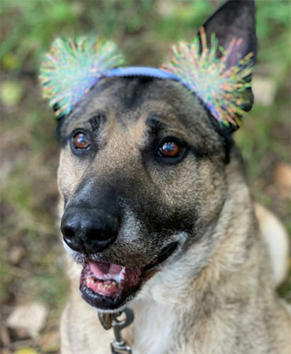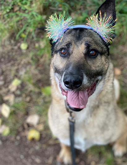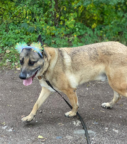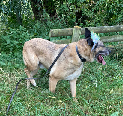 Tonys Gassigängerin der ersten Stunde hat unterwegs einen bunten Haarreif gefunden und aus Tony kurzerhand ein Fotomodell gemacht :)) (mh)
