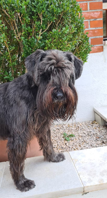 der Papa ist ein grauer Pfeffer- und Salz-Mittelschnauzer,