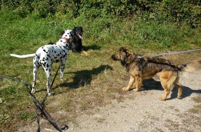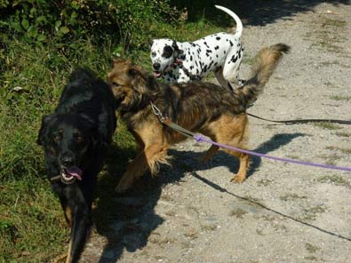 Ulysse zeigt sich mit anderen Hunden verträglich und verspielt, sein einziges Manko ist, dass er hin und wieder versucht aufzureiten. Das kann ihm gerade bei anderen Rüden Ärger einbringen, weshalb ich es ihm konsequent untersage, was er dann auch brav befolgt.